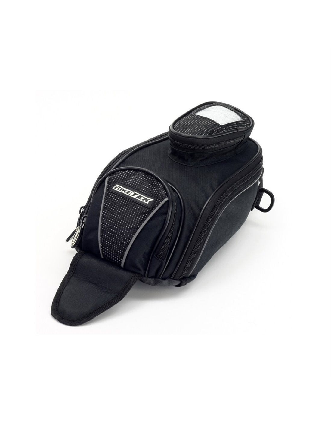Bolsa de deposito de moto de 7 litros. Montaje magnético al tanque de gasolina. Compartimiento frontal para cartera y las llaves. Compartimento teléfono Top con ventana de vinilo transparente.