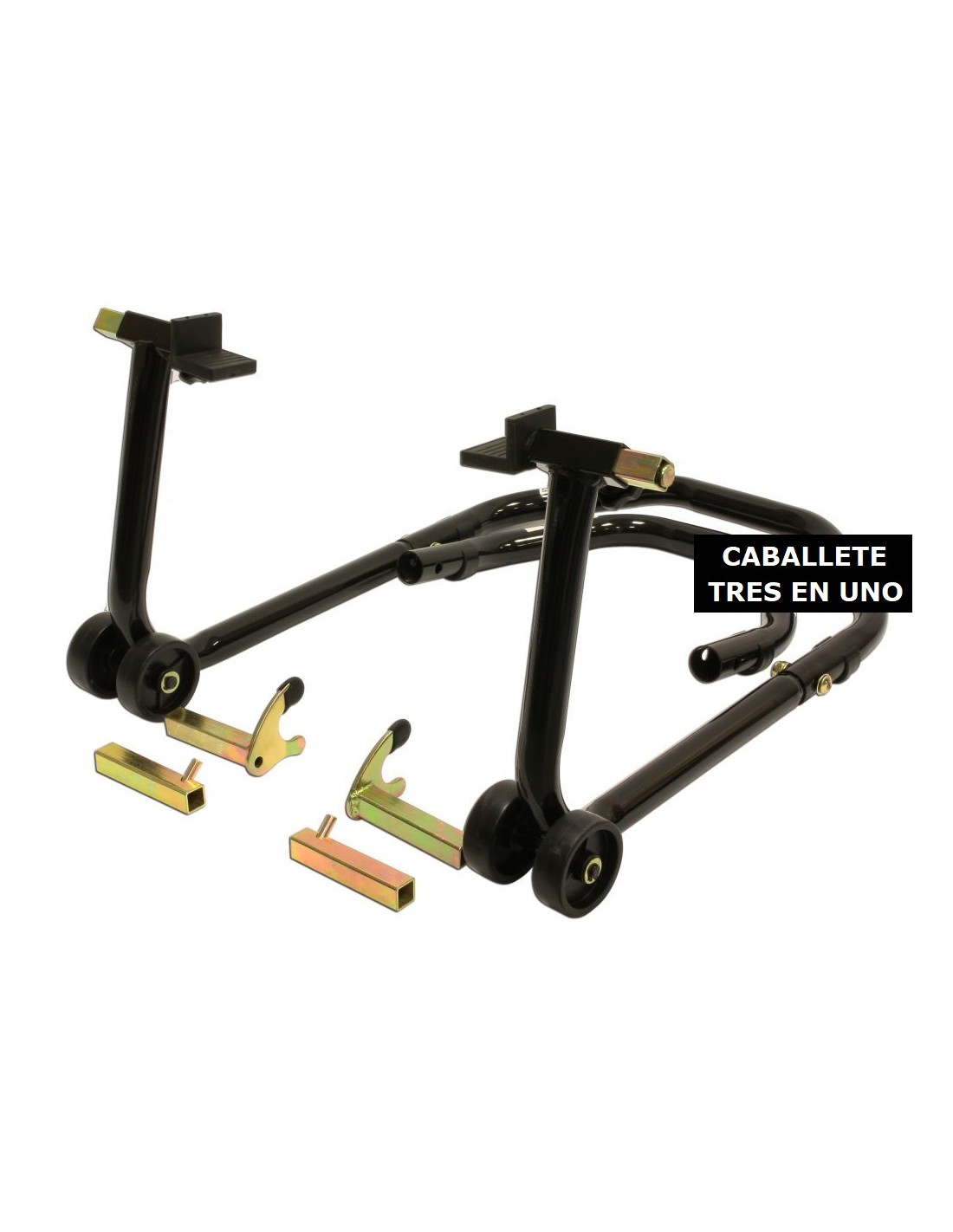 Caballete de moto con doble asa para la rueda delantera y trasera con sistema caballetes 3 en 1.