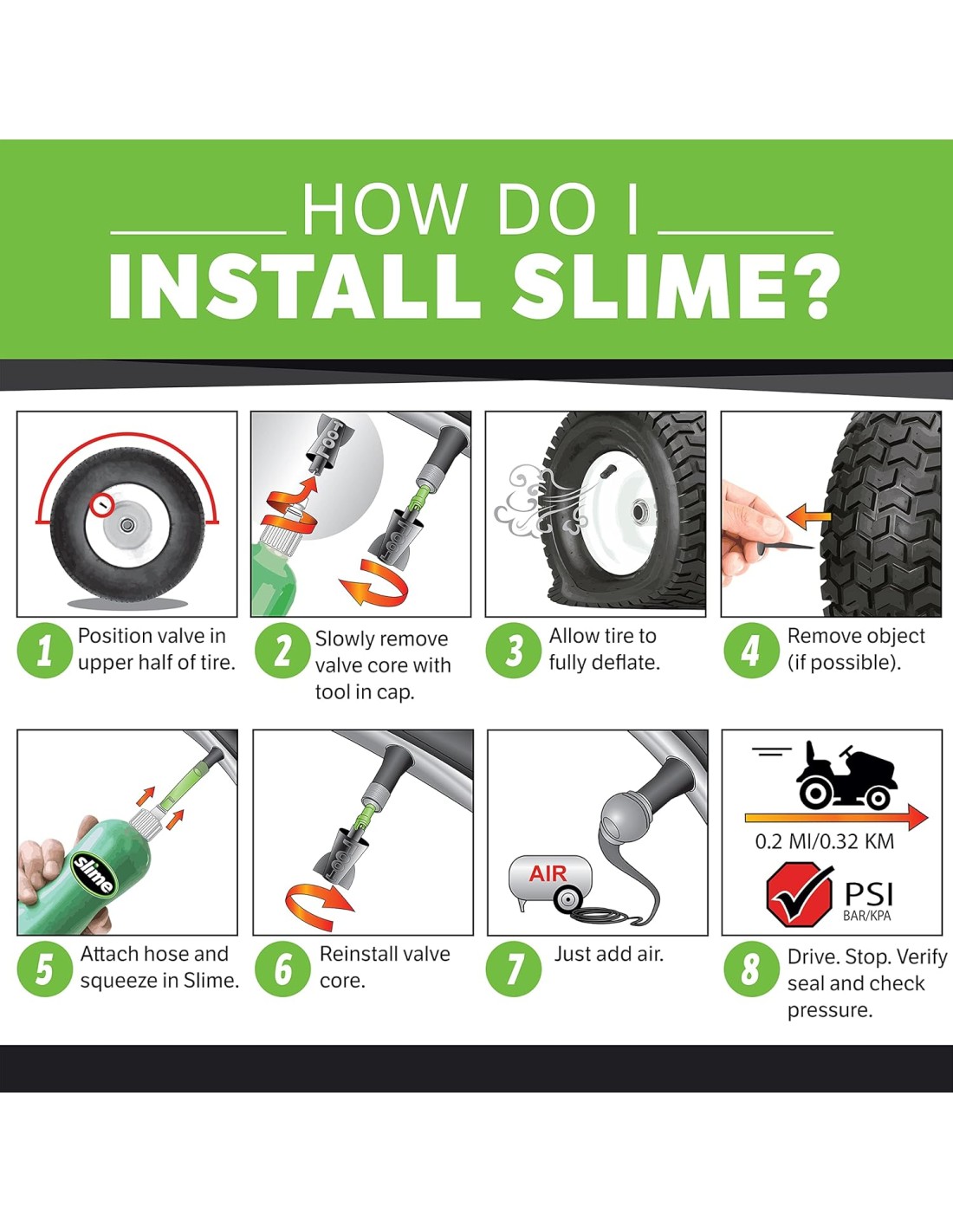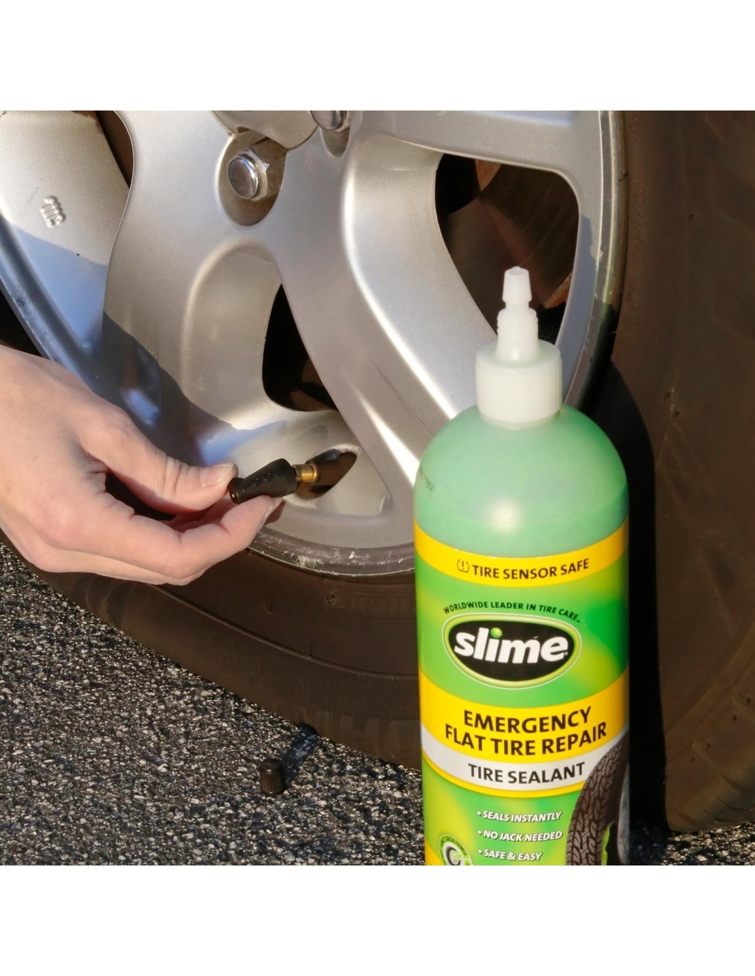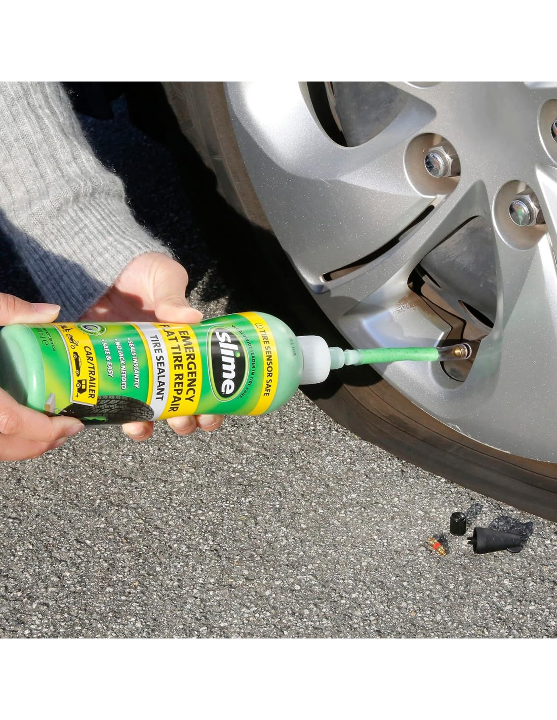Utilice Slime Tire Sealant con una fuente de aire para la reparación de neumáticos de emergencia en vehículos de carretera pequeños/medianos, como automóviles y SUV pequeños.
