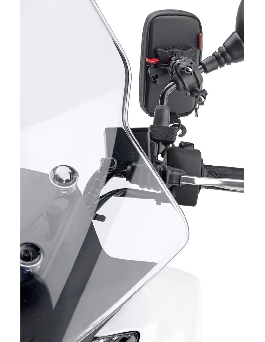 Gracias al sistema de enganche ideado y patentado por GIVI, enganchar y desenganchar el porta smartphone del sistema de fijación es una operación muy sencilla e inmediata, apretando la palanca del soporte de fijación es posible regular la posición del porta smartphone en base a sus necesidades.