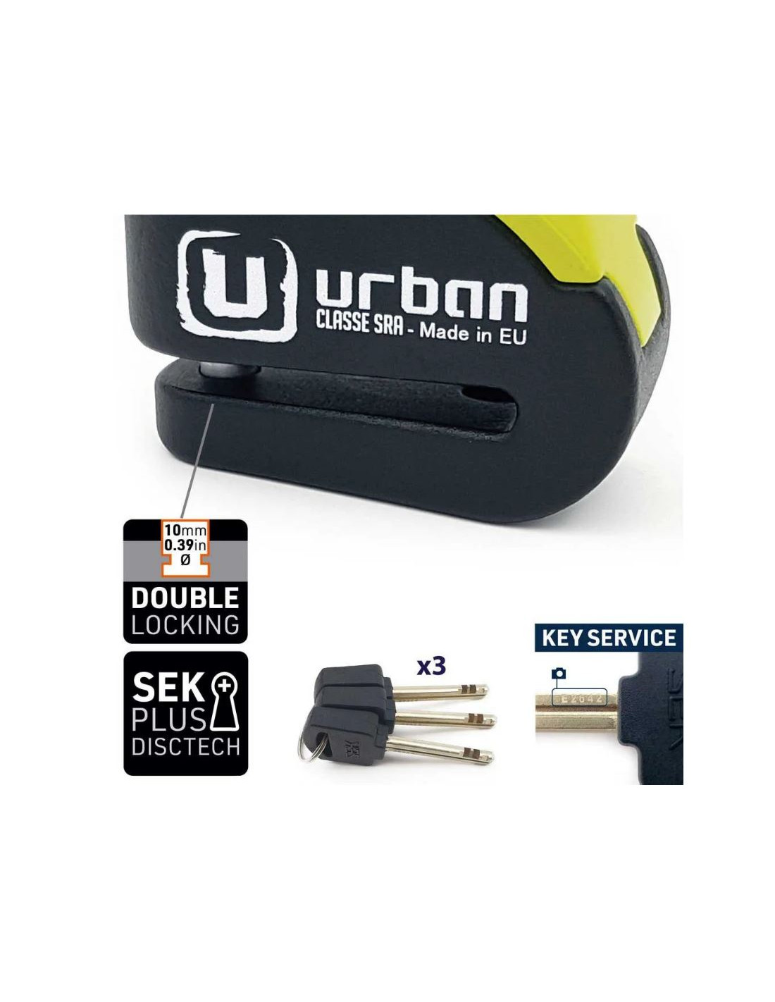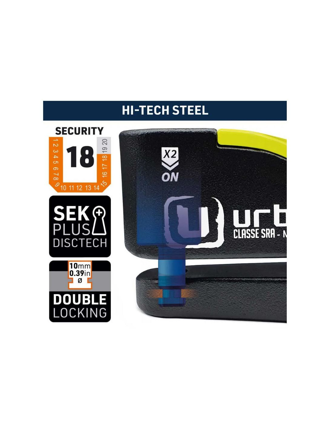Antirrobo Urban Security UR10. Antirrobo con sistema de alarma que puede ser usado con o sin ella. Dispone de un cuerpo con doble tratamiento anti-corrosión y es resistente al agua, de modo que puede ser usado en días de lluvia. Dispone de un sensor A+ de golpes y movimiento que junto a un led rojo avisaran si la moto se encuentra en peligro. Cerradura SEK PLUS DISCTECH. Doble cierre de 10mm en acero.