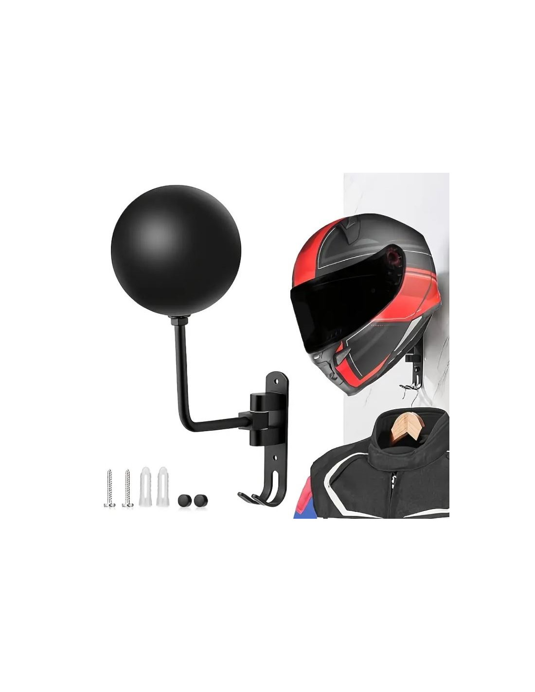 Soporte de pared para sujetar el casco y colgar la cazadora de moto.