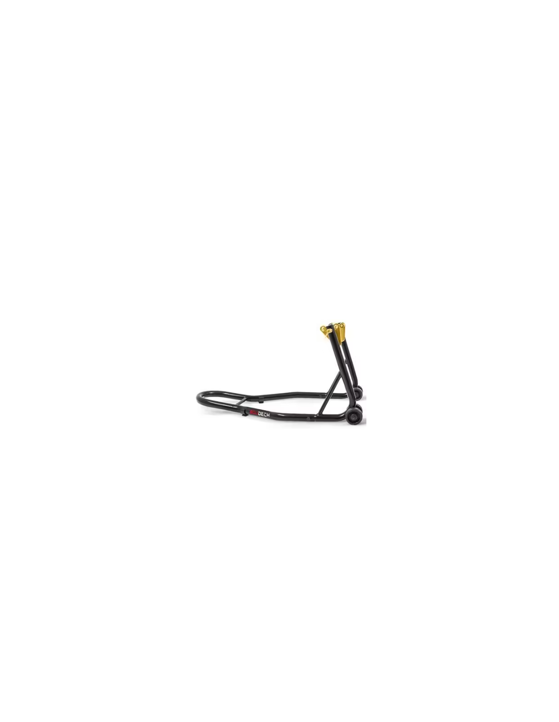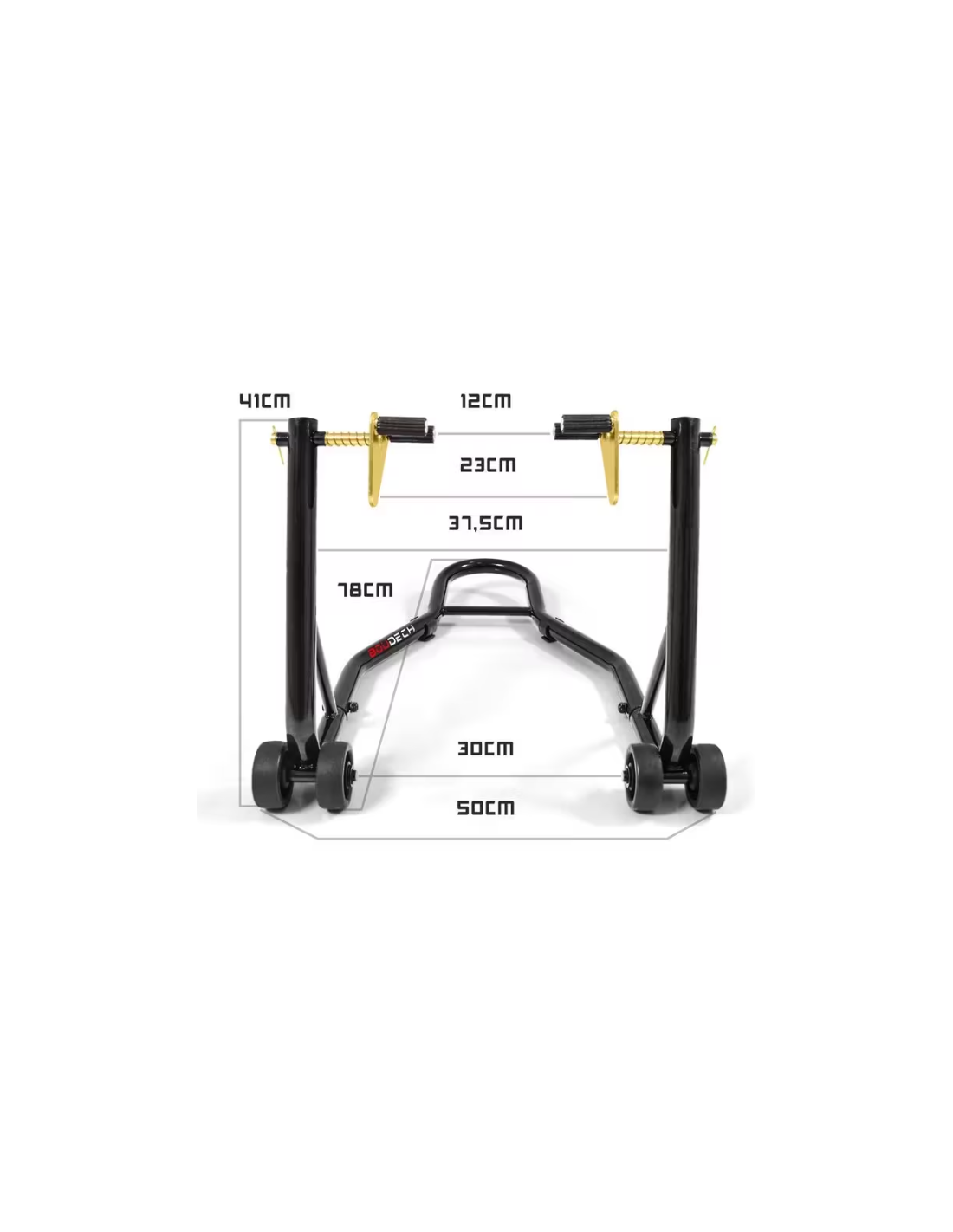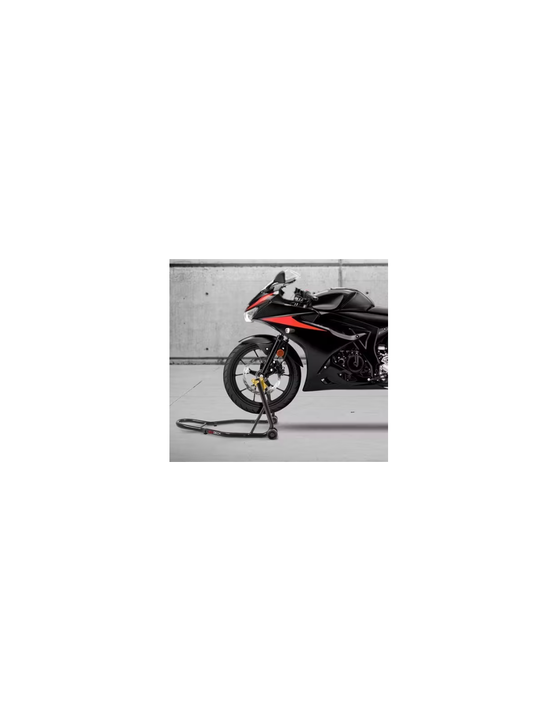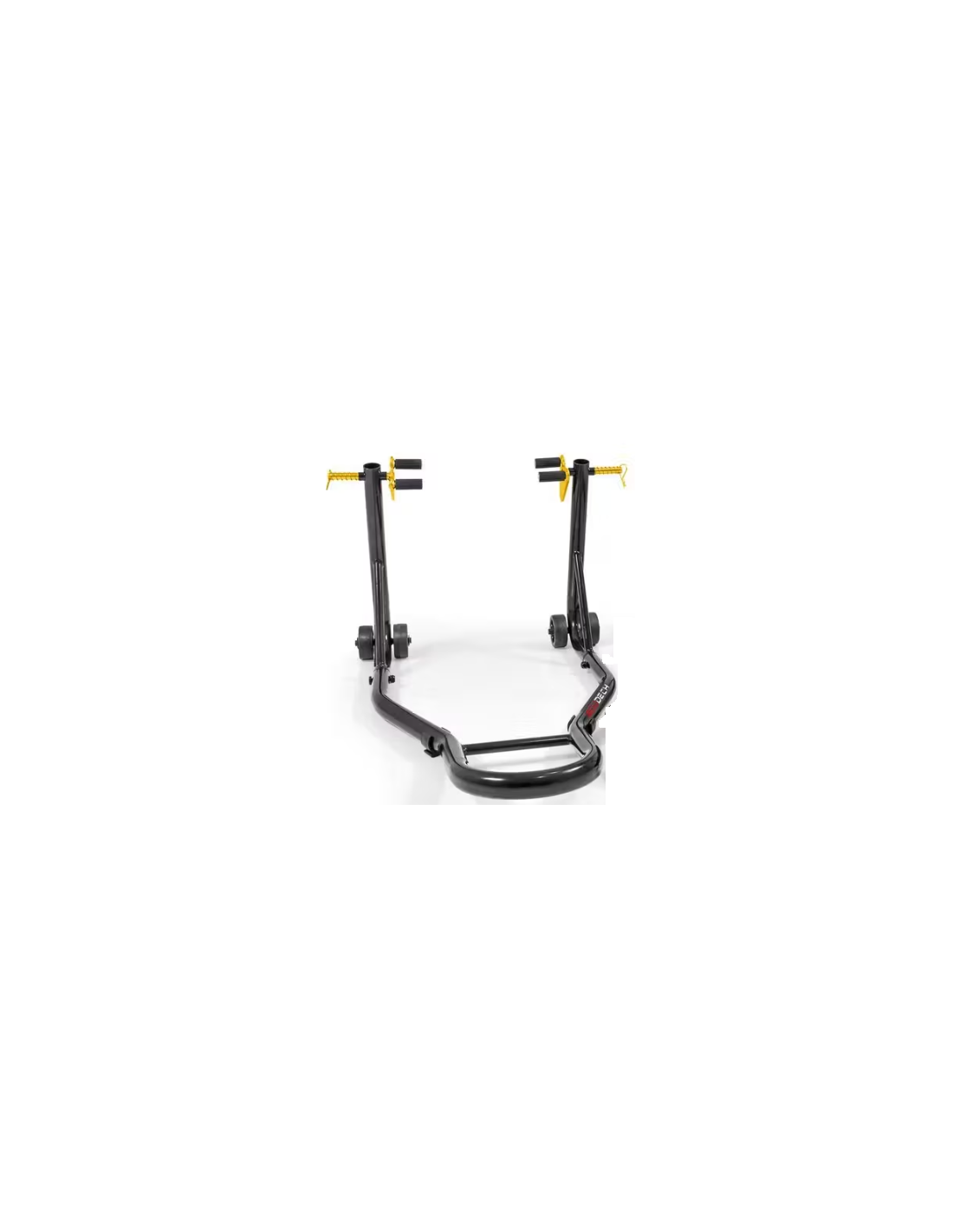 Caballete de moto delantero de moto fabricado en acero con estructura robusta.