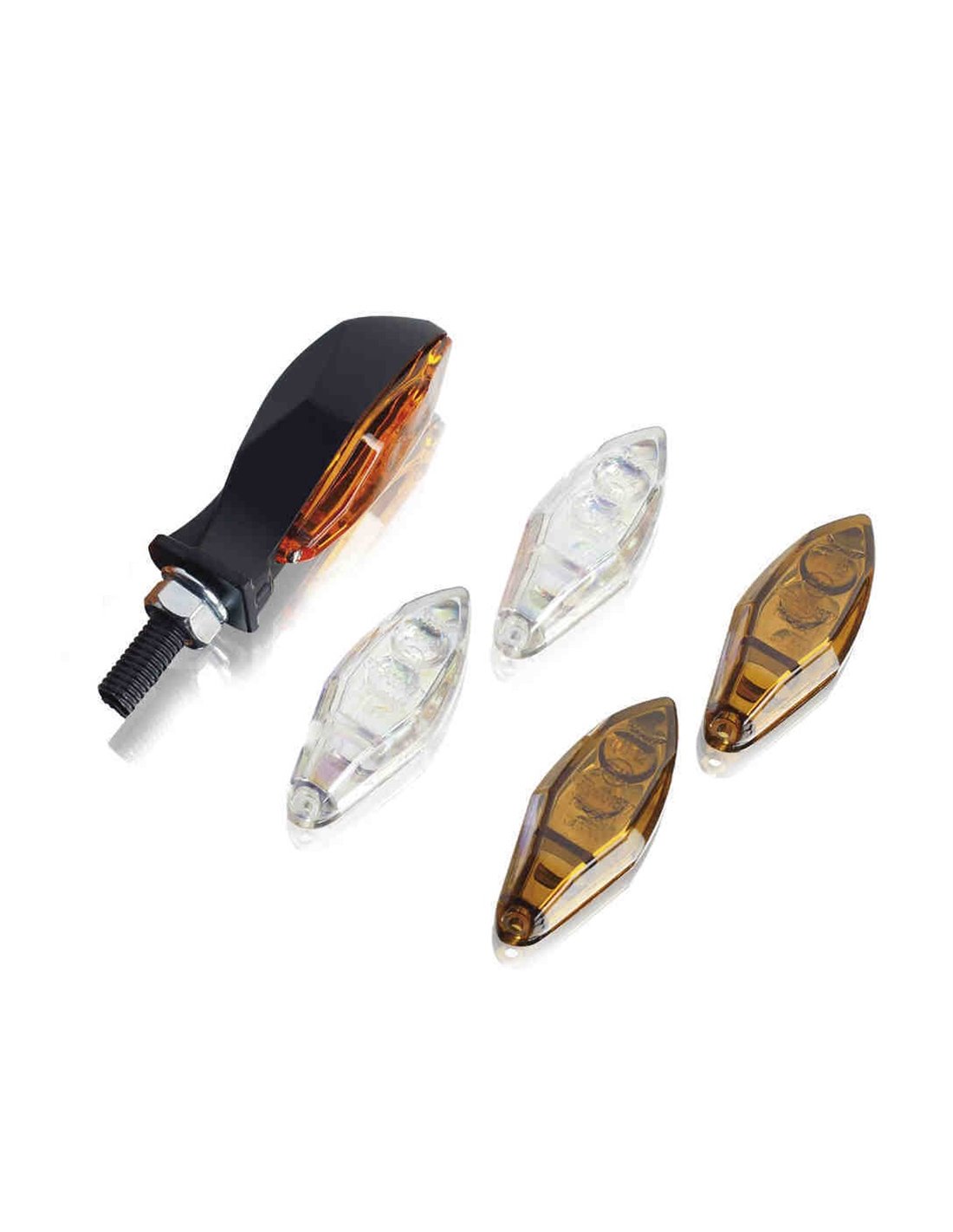Juego de intermitentes de bombilla negro con el cristal ámbar. Homologados. Se sirven dos juegos de tulipas: ahumadas y láser. Brazo corto. Medidas: 60x20mm. Disponemos de recambios de bombillas de 12v-23w y 12v-6w, ya sean ámbars o transparentes. Se sirven en cajas de 10 unidades.